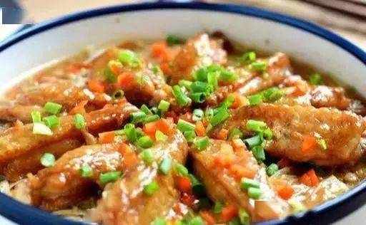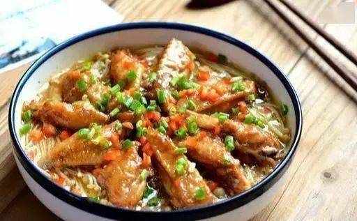 金针菇铺底,鸡翅腌制入味后码放在上面,入锅蒸一蒸。鸡翅滑嫩嫩的有滋味,而金针菇也因为自身的汁水和鸡翅汁混合在一起而变得鲜香脆嫩。撒一点儿绿香葱末和红辣椒丁,整盘看上去热闹非凡,诱人食欲。一定要趁热吃才能吃出金针菇的美妙噢!对了对了,不是常说要多吃一条腿的菜吗?这金针菇的独腿又长又脆又嫩,千万不要放过它!
