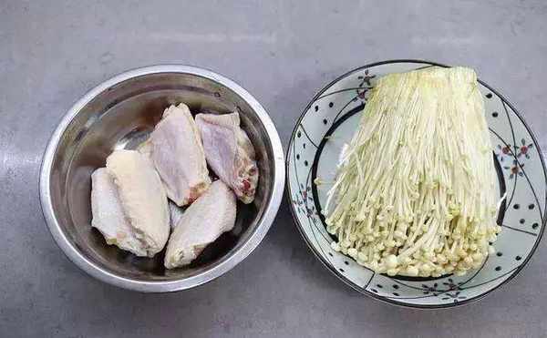 1. 鸡翅中清洗干净,金针菇1把,泡凉水中15分钟,可以将其中所含的秋水仙碱去掉一部分;