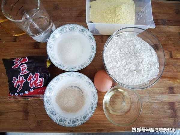 1、首先我们准备需要用到的食材,分别是100克的玉米面,110ml的开水,20克的冷水,200克的普通面粉,一个鸡蛋,适量酵母粉,30克白糖,20克的普通食用油,以及我们需要的馅料---豆沙馅,当然喜欢吃其他馅料的也可以用别的馅料。