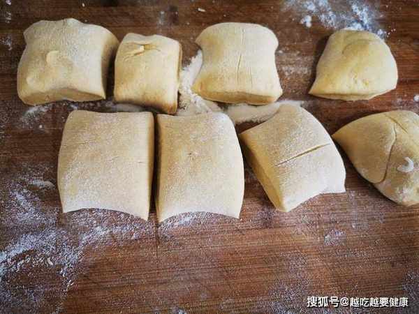 5、之后在面板上撒些干面粉,把醒发好的面团放在案板上揉搓排气,揉成原来面团的大小,之后搓成长条,分成大小均匀的剂子。