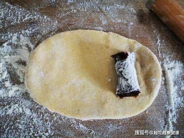 6、接下来我们取出适量的豆沙馅料,之后用少许的干面粉,利用干面粉把豆沙揉成长条,再分成剂子,把面剂子擀开成牛舌状,之后包入一个豆沙馅料。
