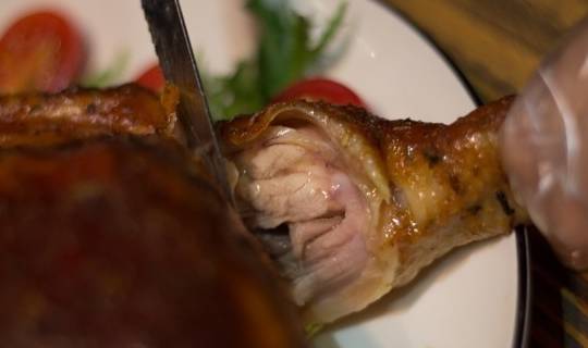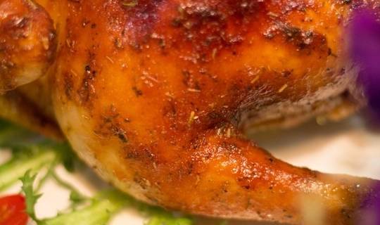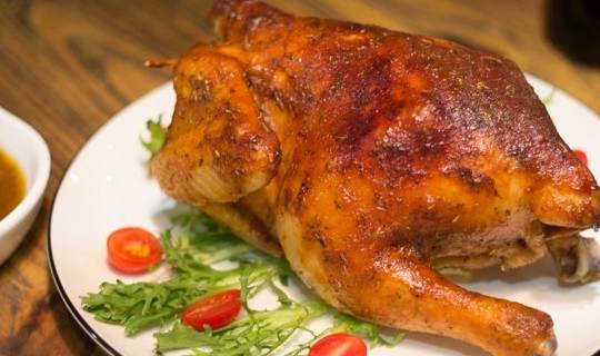 烤鸡端上桌,香味扑鼻而来,那一只色泽诱人、大小适中、颜色均匀的烤鸡真是让人垂涎欲滴。吃前用手机拍照留念,怎么拍都看起来很好吃。待烤鸡温度不那么烫手,就可以暂时抛开安静斯文的吃相,戴上一次性手套痛快淋漓地吃起来。用刀切开鸡腿时有肉汁流出,大口地咬下鸡腿,非常的皮香肉嫩,鲜美多汁。烤鸡事先经过腌制,所以足够入味,咸香可口,混合着各种香料的香味,如果觉得味道淡了些,还可以蘸一蘸店家配的酱汁。