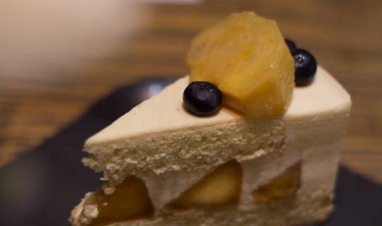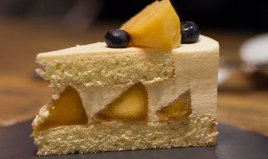 餐后甜点选择了服务员推荐的柿子慕斯。拿柿子来做西式甜点似乎不算常见,所以想要试一试。不过吃起来没有预想中那么好吃。柿子慕斯选用的是脆柿,和入口即化的蛋糕形成口感上的对比,遗憾的是柿子还未熟透,不够甜还带点涩,这让整倒甜点大打折扣。