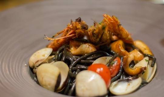 墨西哥脆饼和墨鱼汁意面都是店里的招牌菜。首先说说墨西哥脆饼,香脆的玉米片包裹着鸡肉、芝士和墨西哥辣酱。酸辣的口味加上酥脆的口感应该会受本地人欢迎,我个人很喜欢。墨鱼汁意面,分量有点小,黑黑的意面是加入了墨鱼汁,配有各种海鲜,味道有些鲜甜。