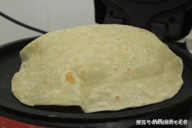 我们烙好以后,取出电饼铛通电加热 ,锅热以后把饼放上 一面热以后就快速翻过来炕另一面。这个饼很薄,反一下正一下,很快就鼓起一个大泡,饼一鼓泡,里面就熟了。