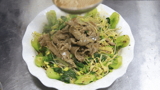 加入淀粉10克,抓拌均匀,让淀粉锁住牛肉中的水分,保持鲜嫩的口感。然后淋入少许植物油作润滑,防止一会下锅滑煮时牛肉粘连。然后就是充分的抓拌,待到拌匀以后,再静置腌制10分钟。
