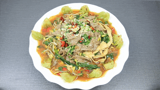 把锅中的汤汁烧开,把牛肉滑煮一下。依次放入牛肉片后,轻轻的推动肉片让其均匀受热。滑煮大概一分钟左右,可以看到牛肉变白,然后就可以起锅,连汤带肉的一起盛放在盆中了。