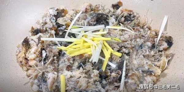 5、这时候,用铁铲将鲫鱼碾碎,放入姜丝、蒜丝。