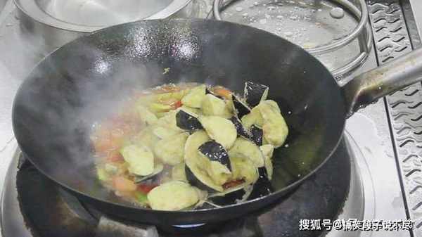 加入水淀粉勾一下汤汁,倒入茄子翻炒,开大火收汁。