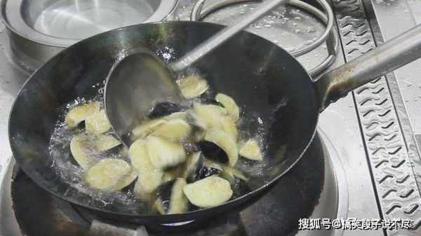 锅里烧油,待油微微冒烟,依次抓入茄子。开小火,慢慢地把茄子炸至金黄,倒出控油。