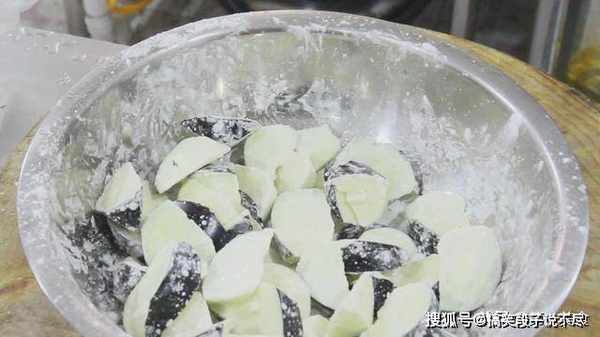 把茄子控去水,撒上干淀粉,颠盆翻匀。