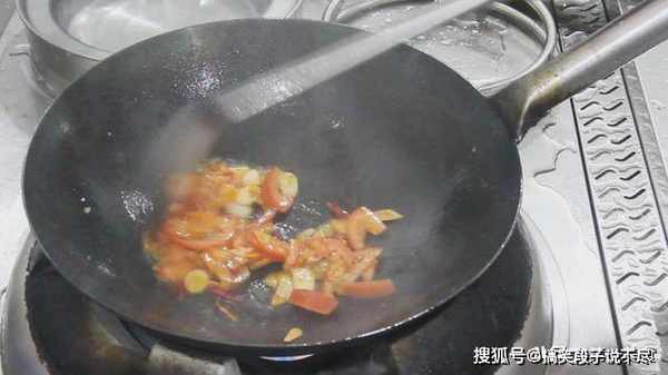 锅里留油,倒入大蒜葱白红干椒,炒出香味。倒入西红柿翻炒,炒出西红柿汁以后,加入青红椒,翻炒几下。加入清水,食盐,胡椒粉,白糖, 加入老抽,调一下底色,翻炒化开调料。