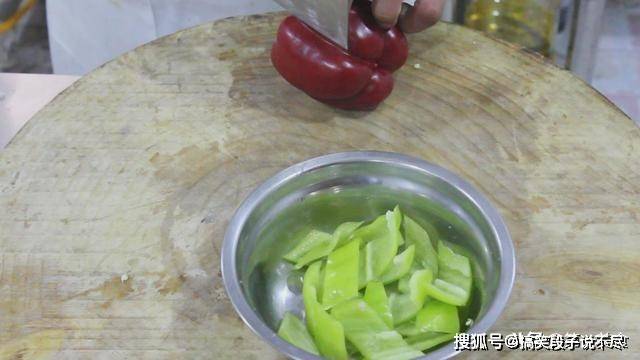 青椒一个,去籽,切成菱形片。柿子椒小半个,切成片。西红柿半个,切成小块。
