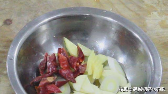 大葱白一段,切厚片。生姜切片。大蒜切片。加入一把红干椒。