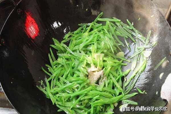 然后倒入芸豆快速翻炒,这个过程要开大火快速爆炒,把芸豆炒至断生、开始调味,加入食盐2克、鸡粉1克、白糖1克、辣椒酱5克。