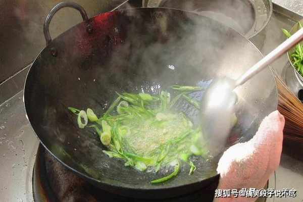 所有食材准备好后,我们开始烹饪,锅内烧油、油烧热后 倒入葱蒜、线椒丝翻炒出香味。