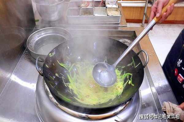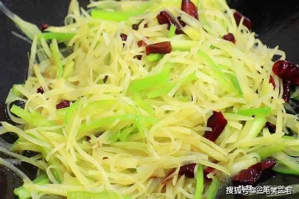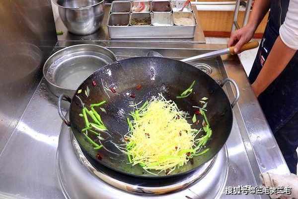 然后放入青椒丝翻炒几下,倒入沥干水分的土豆丝,开大火爆炒20秒钟把土豆丝炒断生,家庭小灶的话大概需要50秒钟。