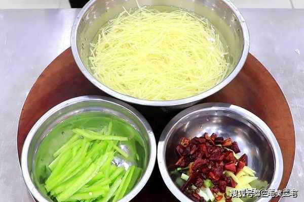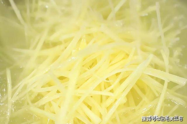 把切好的土豆丝用清水多淘洗几遍,充分洗净上面的淀粉,洗至水很清澈才可以,这样炒的时候即便不焯水,也依然清脆不粘连。洗干净以后用清水泡上,防止氧化变黑。