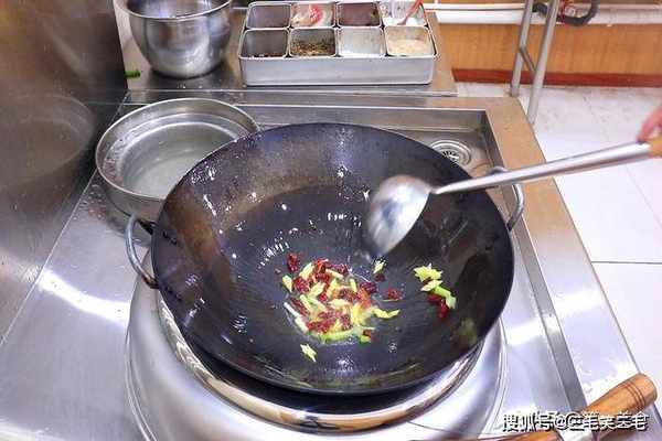 食材准备好以后我们开始烹饪:锅内烧油、充分滑锅以后倒出热油、加入凉油,这一步主要是为了防止粘锅。油温5成热时倒入葱姜、干辣椒和花椒,再淋入一点白醋,开小火爆香,