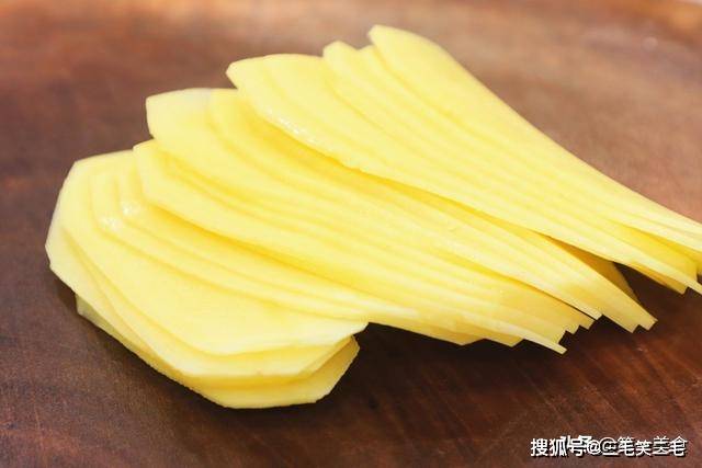 然后先切成均匀薄片,切的时候保持刀与案板呈90度,尽量保证土豆片薄厚一致。