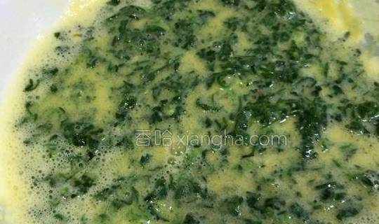 7.炒好的菜碎倒入蛋液搅拌均匀。