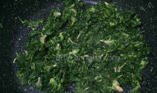 6.炒锅倒入适量油,五成热时倒入荠菜碎。将荠菜碎炒匀即可,菜碎尽情吸满了油脂,口感会滑爽一些。