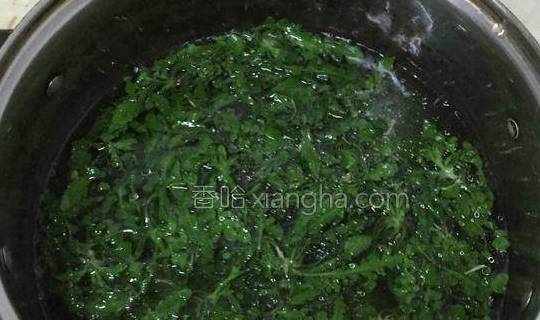 2.将荠菜择净,去黄叶,浸泡并多冲洗几遍。洗净后,倒入含少许盐和食用油的开水锅,烫半分钟,叶子即刻青葱翠绿。