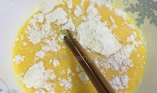 4.鸡蛋打开入碗,倒入少许料酒,可使鸡蛋饼摊得蓬松一些。打散蛋液,加入少许盐和2勺牛奶。5.筛入1勺面粉。