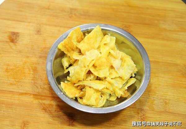 4.锅内烧油,充分滑锅以后倒出热油加入凉油,把鸡蛋液倒入锅中,均匀铺在锅底,摊成圆形的蛋饼,煎至鸡蛋液全部定型翻另一面面,大约煎2分钟,蛋饼两面呈金黄色时倒出控油,切成均匀小块。