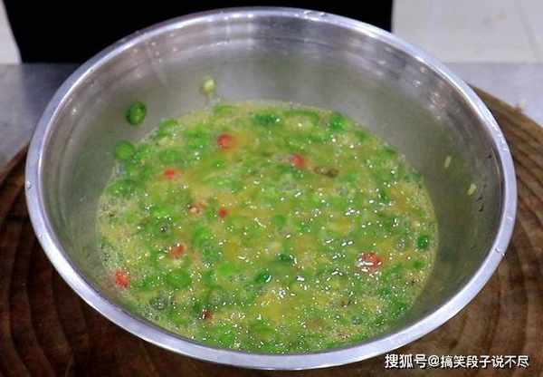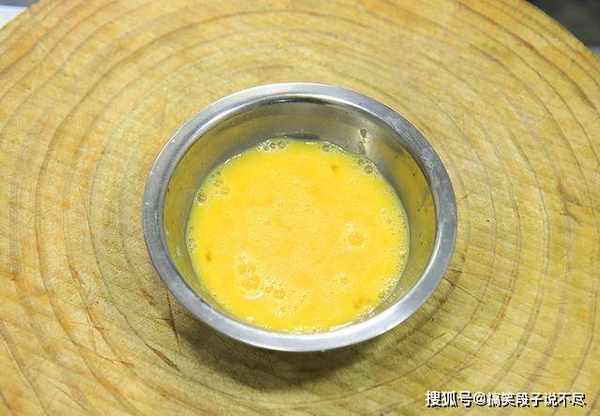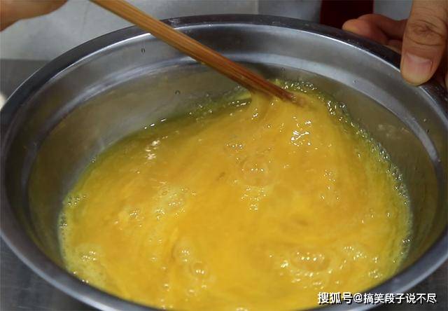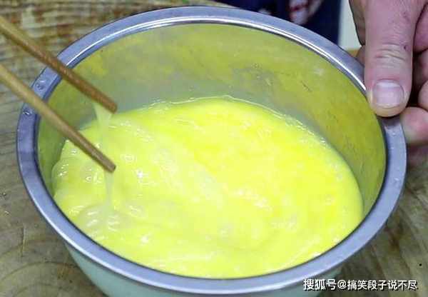 1.准备一个小盆,打入4个鸡蛋,加入食盐2克,白糖80克,用筷子快速把鸡蛋打散,一直打到把白糖化开为止,这一步比较累人,可以借助工具。