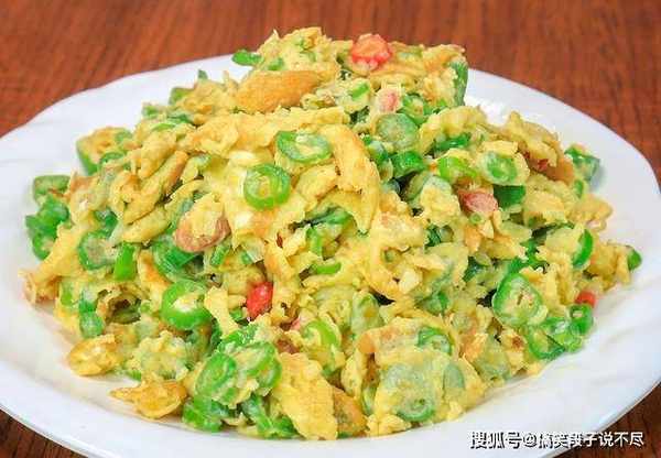 3.锅内烧油,充分滑锅以后,倒出热油留少许底油,把青椒、红椒、葱花倒入锅中进行煸炒,炒出里面的水分。辣椒炒香炒至7成熟时起锅,把青椒、红椒倒在蛋液里面搅拌均匀。