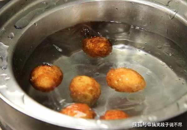 4.锅内烧油,油温五成热时把鸡蛋放入锅中,保持小火炸3分钟左右,鸡蛋表面呈金黄色、蛋清起皱时捞出,放入清水中浸泡20分钟,这一步的目的是让鸡蛋表皮胀发、起虎皮斑。
