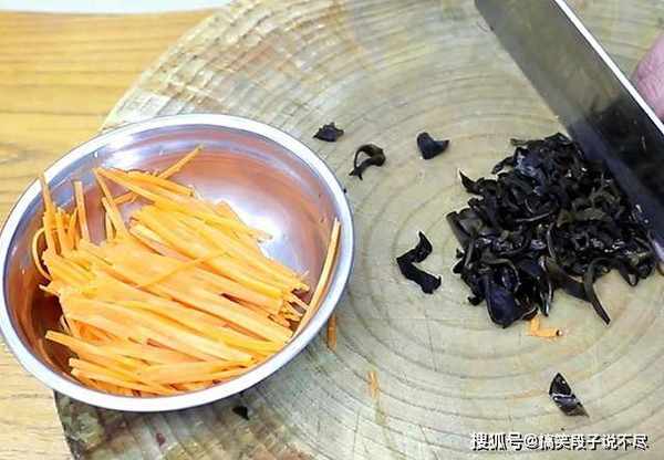 1.准备胡萝卜半根,切成细丝;一把木耳,已经提前泡发好了,切成丝备用。