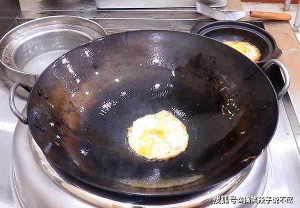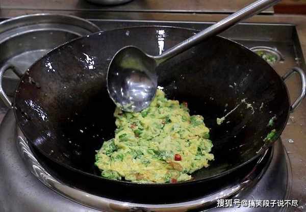 4.锅内再烧油,充分滑锅以后,倒出热油加入凉油,把蛋液倒入锅中,轻轻地推散让其均匀受热,一面煎好以后翻过来再煎另一面,就这样来回多翻几次。