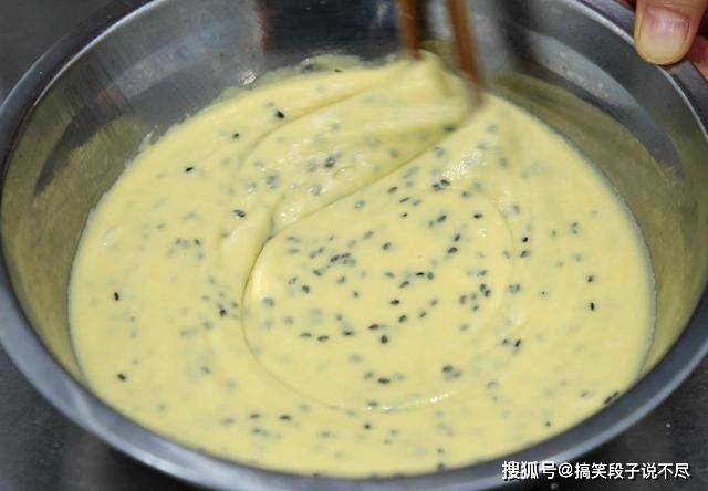 3.倒入低筋面粉90克,低筋面粉要过一下筛子,筛细一点,搅拌成糊,再加入一把黑芝麻,再次搅拌调匀。