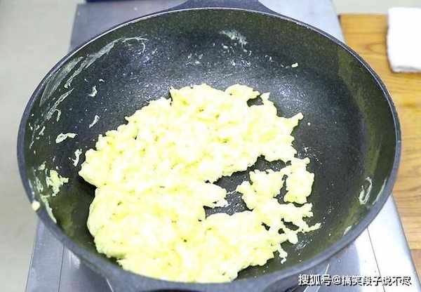 5.把锅烧热,加入植物油滑锅,滑好锅以后倒出热油加入凉油,热锅凉油炒鸡蛋时不容易粘锅,把蛋液倒入锅中,开小火炒,蛋液全部定型以后用筷子搅散,这样炒出来的鸡蛋又嫩又滑。