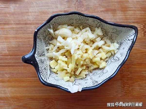 3、大蒜拍扁,姜切片,切成碎末,装入碗中备用。