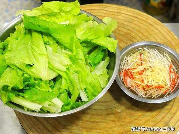 一把生菜清洗干净控水备用;大葱白一小段去芯,然后切成葱丝;生姜一小块切成姜丝;将葱和姜丝放在一起;小米椒两个去籽后切成细丝,不能吃辣的朋友小米椒可以不放;大蒜几粒切成细丝。