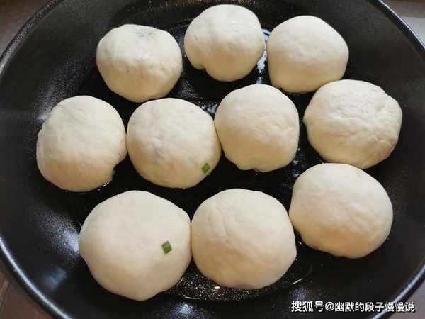 6、平底锅中倒入食用油,刷均匀,把做好的煎包生胚放进去,收口处朝下,先不要急着开火,让它们再松弛一会,大概10分钟就好。