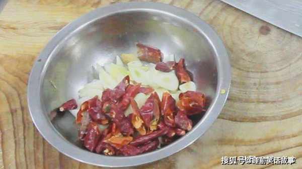 大葱白切成斜片,生姜切成菱形片,大蒜切成片,再加入一把红干椒。
