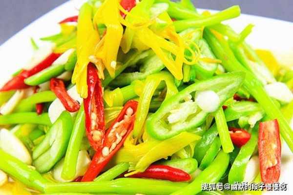 然后把黄花菜控干水分,浇上凉拌汁,放入青线椒和小米椒一起搅拌匀,就可以装盘食用了。