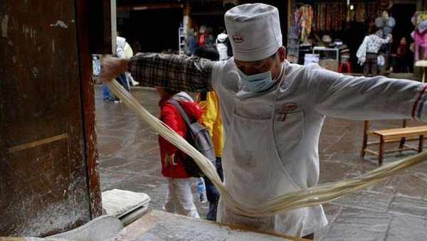 挞挞面是荥经的一种特殊手工面,也是当地人最喜欢的一种早点,这种独特的制面工艺流传到现在已经有100多年历史了,可以说早在民国时期就有了,这道面要经过调、和、揉、挞等几道工序才能做成如此劲道可口的面,尤其是“挞”堪称一绝。