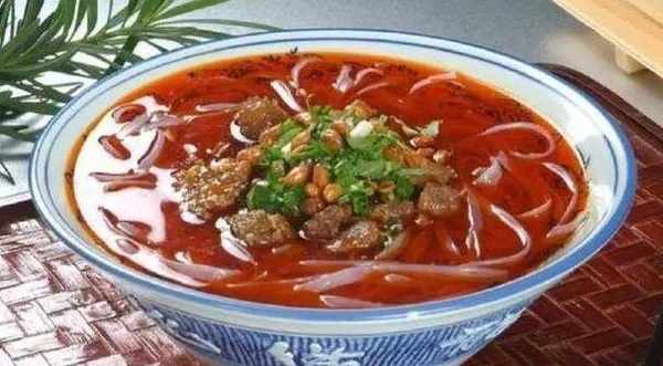 火锅牛肉粉是四川省雅安市的一道著名小吃,它是用火锅汤料煮烫粉丝,然后再搭配上牛臊子制作而成,做好的牛肉粉带有浓烈的火锅风味,吃着菜味浓而香。