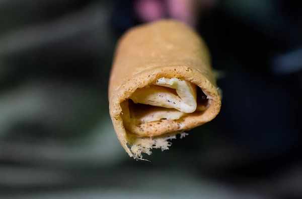 最后一步就是趁着薄饼未硬时将其卷成筒状,现在已经有机器可以代替这个步骤,但厚街许多店家还是坚持手工制作,口感才不会那么呆板,才够得上香酥脆口。厚街蛋卷口感酥脆,刚一进嘴巴没怎么用力,蛋卷就纷纷散开,变成片片的碎块散播在你口腔中的每个角落。等到碎末触碰到舌头时,立刻能感受到鸡蛋独有的香气,蛋味与甜味此起彼伏,层次十分丰富。