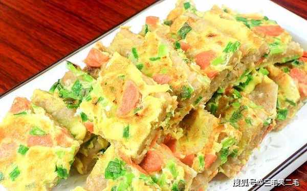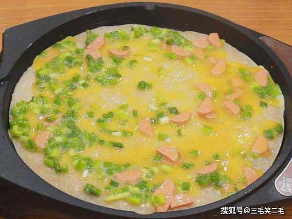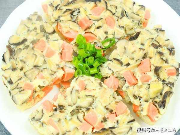 燕麦片200克;一把小葱切成葱花;一根火腿切成薄片;火腿也可以换成红椒丁、胡萝卜丁。碗中打入三个鸡蛋,加入葱花、火腿肠、食盐2克搅散成鸡蛋液备用。