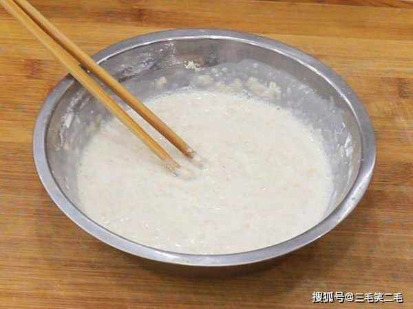 盆中加入燕麦片,然后加入纯牛奶100毫升、一小把面粉来增加粘性,所以不需要太多,搅拌至没有干面粉,再加入100毫升的清水,调成稀一些的面糊备用。