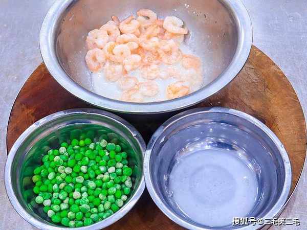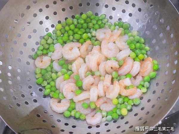 锅内烧水,水烧开以后放入青豆,淋入一点植物油,汆煮1分钟左右,青豆断生以后放入虾仁继续煮20秒钟,虾仁变红以后倒出来用清水冲洗干净控水备用。