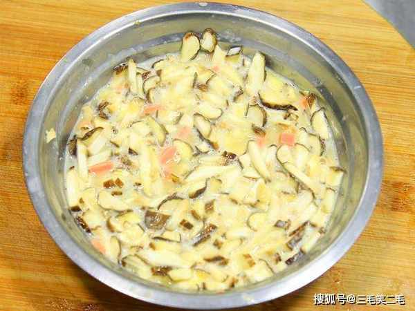 盆中打入三个鸡蛋,加入火腿肠、香菇粒、食盐2克、鸡精1克,添入适量清水搅拌,再加入干淀粉10克拌匀以后备用。