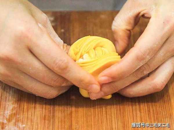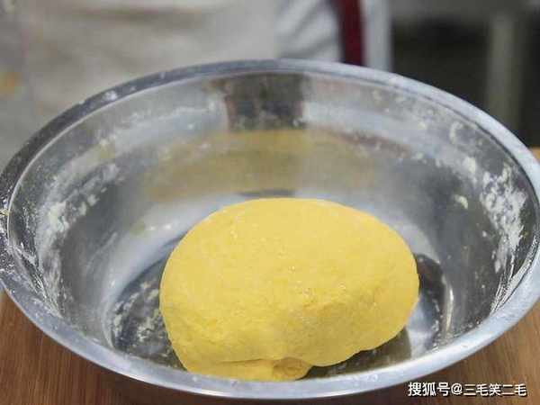 一小块南瓜去皮后切成小块,上锅蒸15分钟左右,取出用勺子按压成南瓜泥,晾凉后倒入酵母3克搅拌化开酵母,倒入普通面粉200克揉成南瓜面团,盖上锅盖发酵1个小时,发酵好后,可以看到面团下面全是蜂窝眼,面团已经发酵完成。
