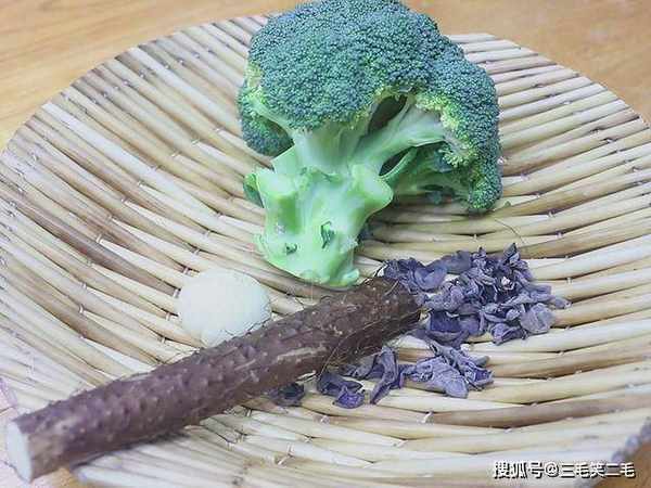 锅内烧水,大火烧开以后加入少许食盐、一点植物油锁住营养,放入西兰花、山药、木耳和辣椒片汆煮1分钟左右,食材断生以后捞出冲凉控水备用。